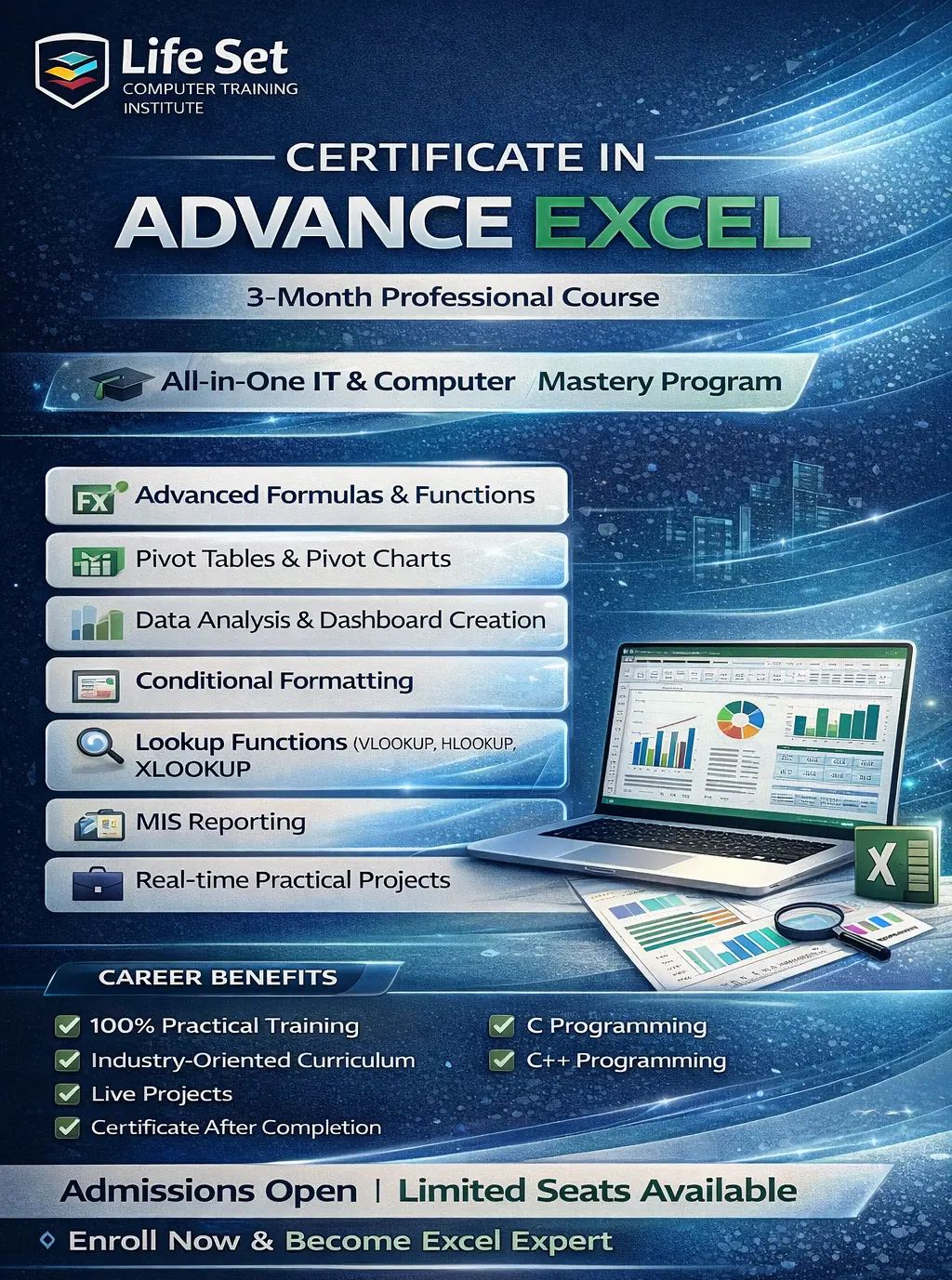 Life Set Computer Training Institute is a leading training institute in Gurugram, dedicated to providing quality computer education for the past 10+ years. Our mission is to make education accessible, affordable, and practical for everyone. We focus on skill-based learning that helps students become job-ready and confident in real-world environments. From basic computer knowledge to advanced IT and designing skills, we offer industry-relevant courses with hands-on training and expert guidance. We believe education is not a business, but a service, and we are committed to helping students build successful careers and achieve financial independence.